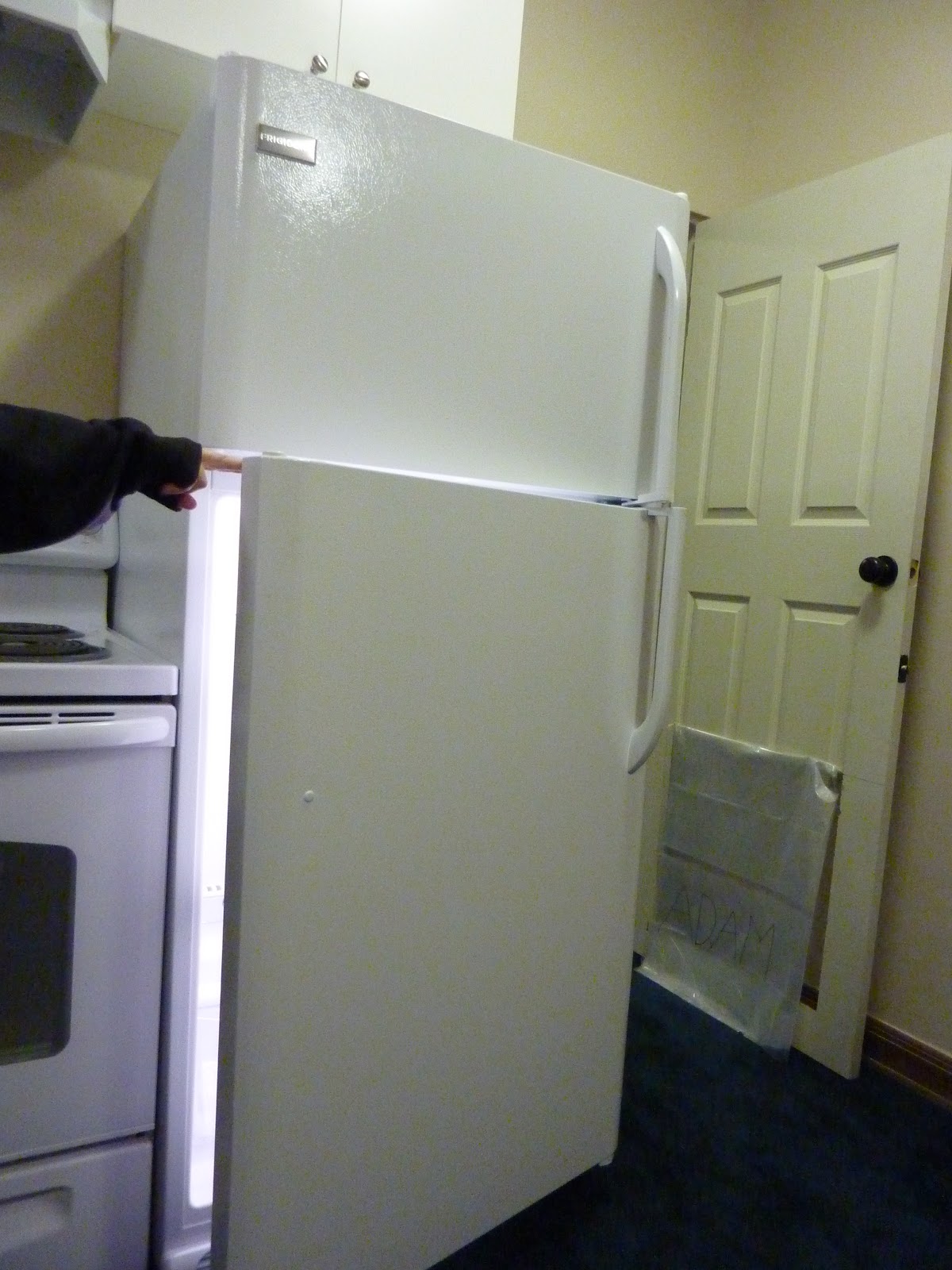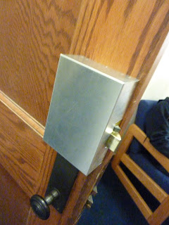 Finally, what may well be the most annoying prank involved the doors to the apartment. Doors in the South Hovses have small interior latches which you need access to in order to open the door from inside. Adam’s apartment has one door that opens to Blacker and one that opens to Ricketts. For the Blacker door, we built a small, very irritating aluminum box that blocked off the locking mechanism on the inside. So if the door is shut, it cannot be opened from within unless you can remove the box. For the Ricketts door, we changed the combination, so it cannot be opened from outside unless you know the new combo. From the outside, it takes quite a bit of time to get from the Ricketts side of the apartment to the Blacker side, involving going down, then up a flight of stairs. Hence, an irritating unidirectional apartment!