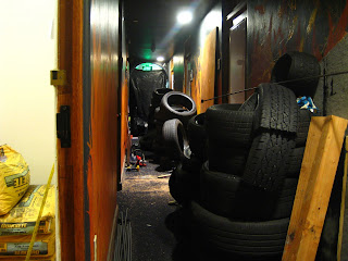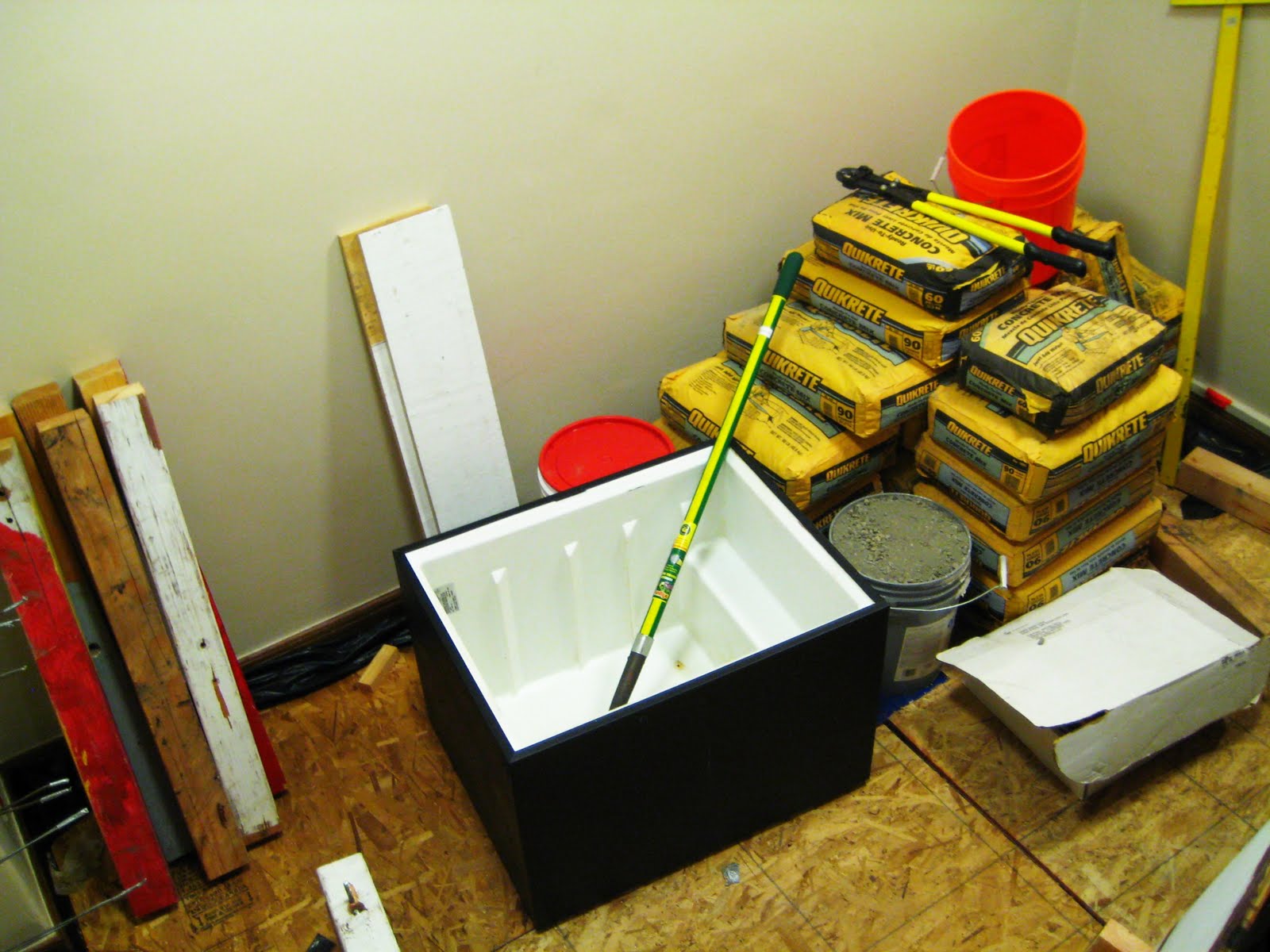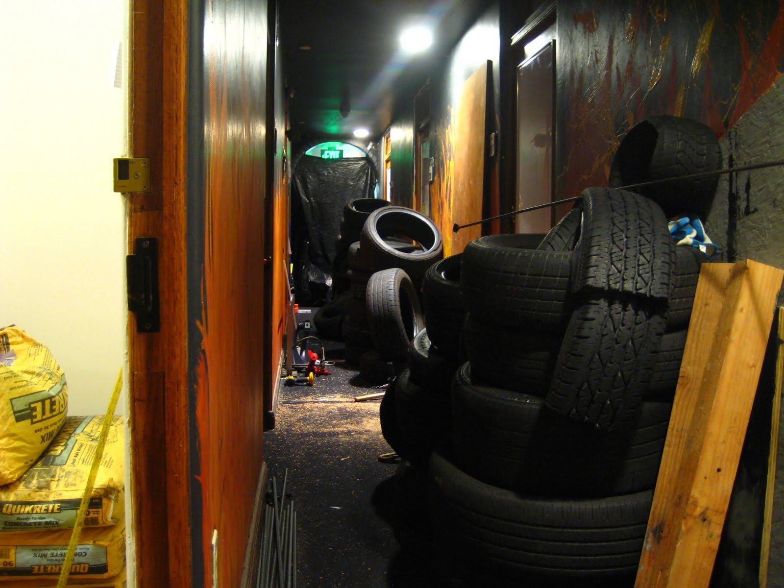 The plan was to replace Robb’s door with a reinforced concrete block, with pieces of tire bolted to the front to absorb much of the inevitable sledgehammer blows. In this picture, about 1/3 of the block had been poured: