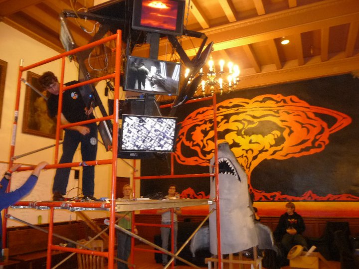 During first term we built Big Interhovse, an event where all the four South Hovse courtyards have simultaneous themed parties with lots of construction and decoration. Our theme was Action Movie Climax. Naturally, we built a model of the Golden Gate Bridge for our dance floor, with 40 foot towers that extended well above the roofs of the Hovse…
